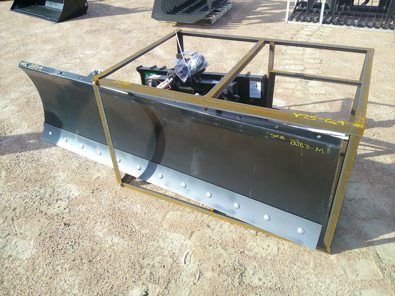 95" wide, approx 890#, standard skidsteer quick tach, 2 line hydraulics, hdraulic angle & tilt (6 way blade), adjustable skid shoes, 4 adjustable trip springs... read more