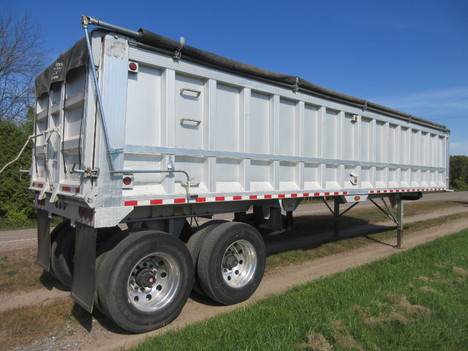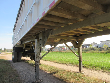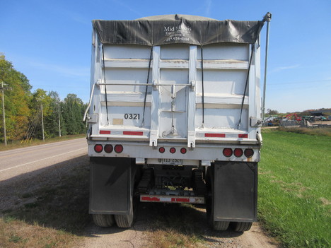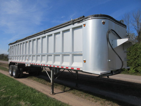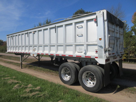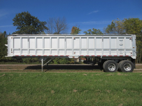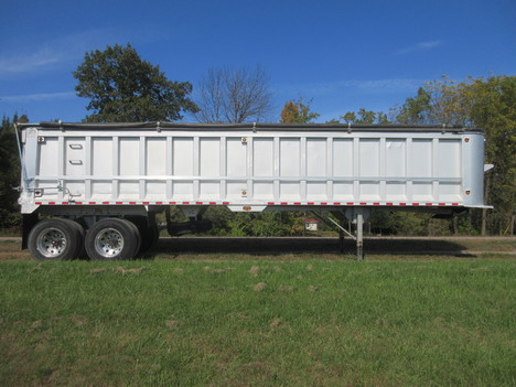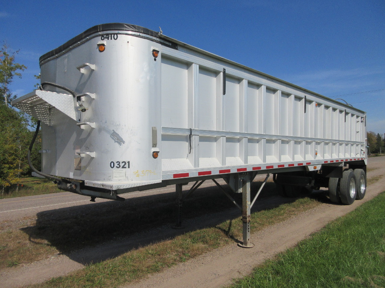 hinged 5th plate, 80,000# GVWR, 65" sides, 35' long, 8' width, 18" king pin setting, roll tarp, flip tailgate w/ grain chute, single line hyds