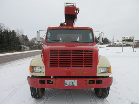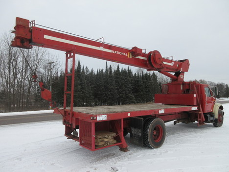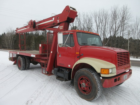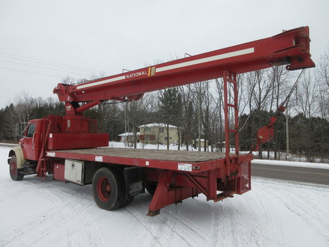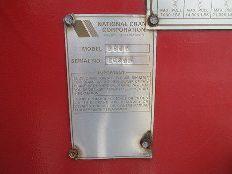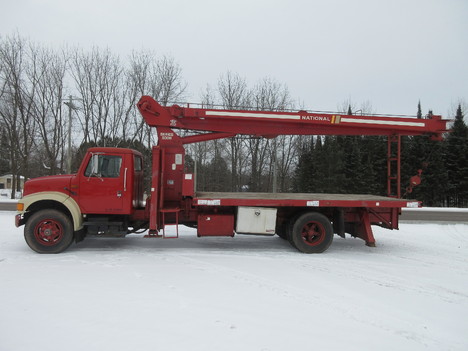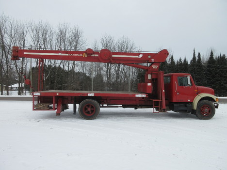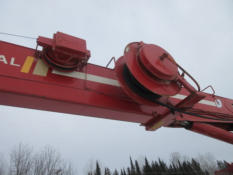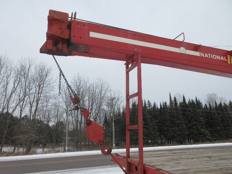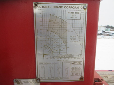 75' main boom lift, 115' lift height w/ 42' jib, 25,000# capacity, 18' flatbed, National 566B crane, 4 point outriggers, dual side controls, hyd hose reel, anti 2 block device